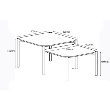 A nagyobb asztal mérete 80x80 cm és 45 cm magas, míg a kisebb asztal mérete 60x60 cm és 40 cm magas.