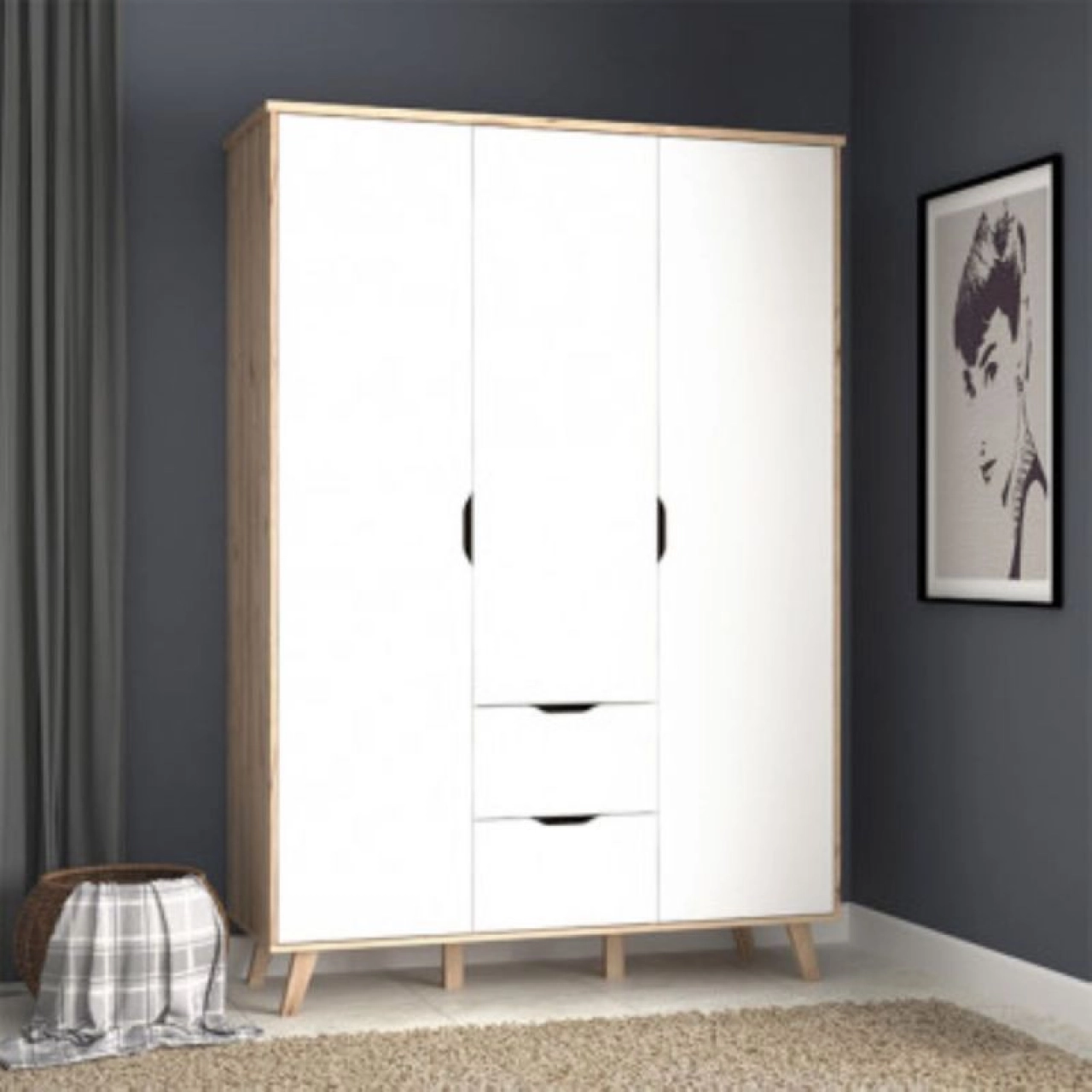 Leírás: Praktikus gardrób modern dizájnnal, amely tökéletesen illeszkedik hálószobájába, és feldobja annak megjelenését. A háromajtós szekrény bőséges tárhelyet biztosít, hiszen egyik oldalán öt polcos szekrény, másik oldalán pedig egy nagy szekrény akasztórúddal és egy extra polccal található. Között két tágas fiók található. A fiókok és ajtók félkör alakú kivágásai a fogantyúkat helyettesítik, praktikum és biztonságot nyújtva. A szekrény hat falábon áll, amelyek tovább hangsúlyozzák modern megjelenését. A sonoma tölgy utánzat és a fehér gyönyörű kombinációjában kapható. Ellenőrizze a többi elemet is ugyanabból a programból.